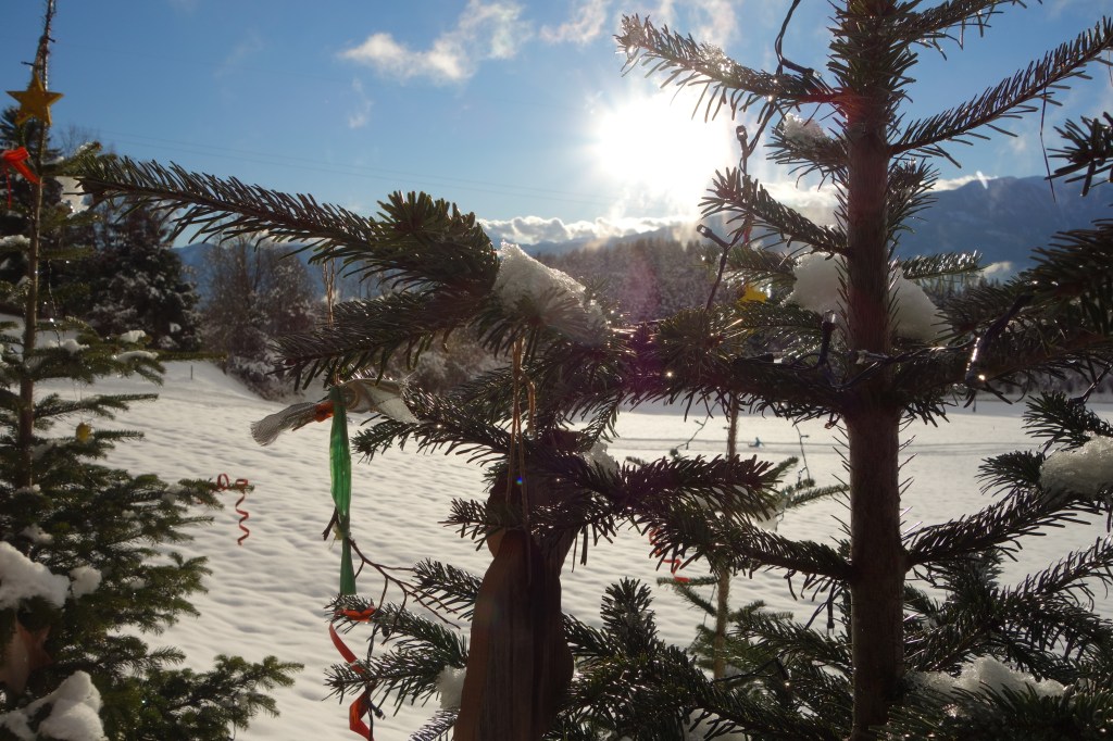 meinst du schon, mit Schneegestöber, hat der Baum dich übergossen.